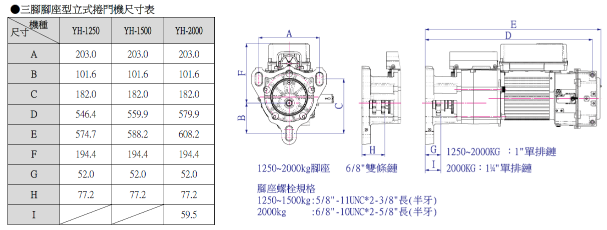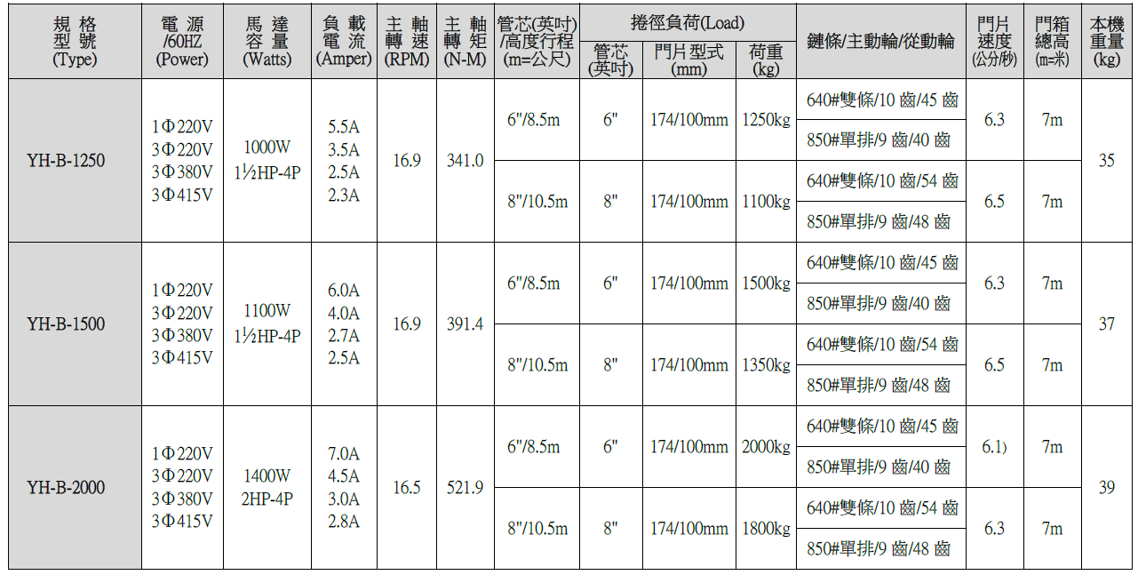 YH-B 1250~2000KG立式捲門機生產規格一覽表
