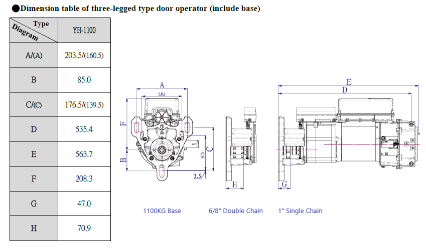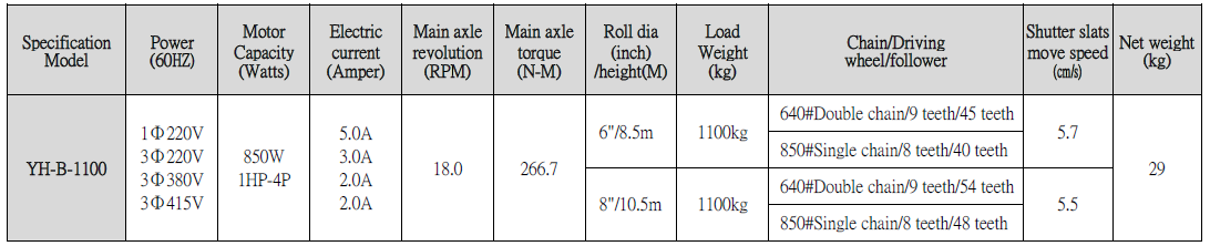 Specification of YH-B 1100KG door operator