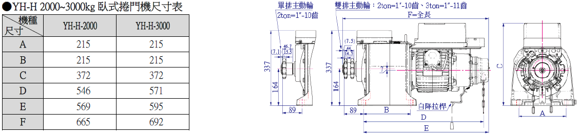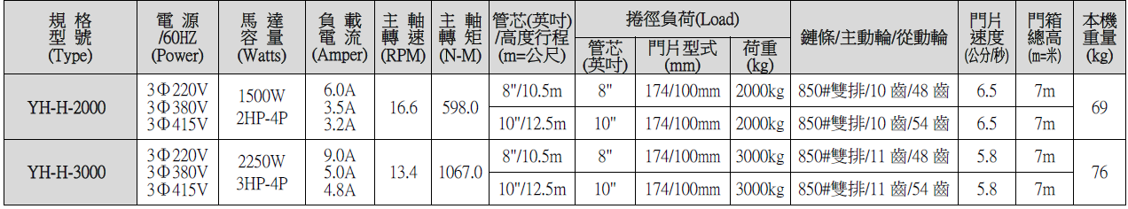 YH-H 2000~3000KG臥式捲門機生產規格一覽表