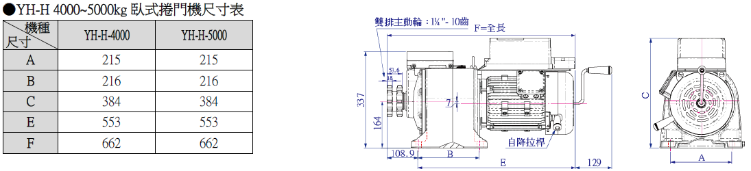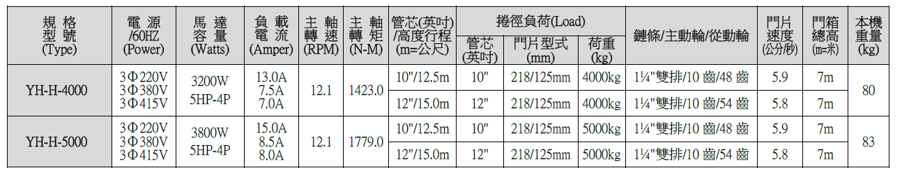 YH-H 4000~5000KG臥式捲門機生產規格一覽表