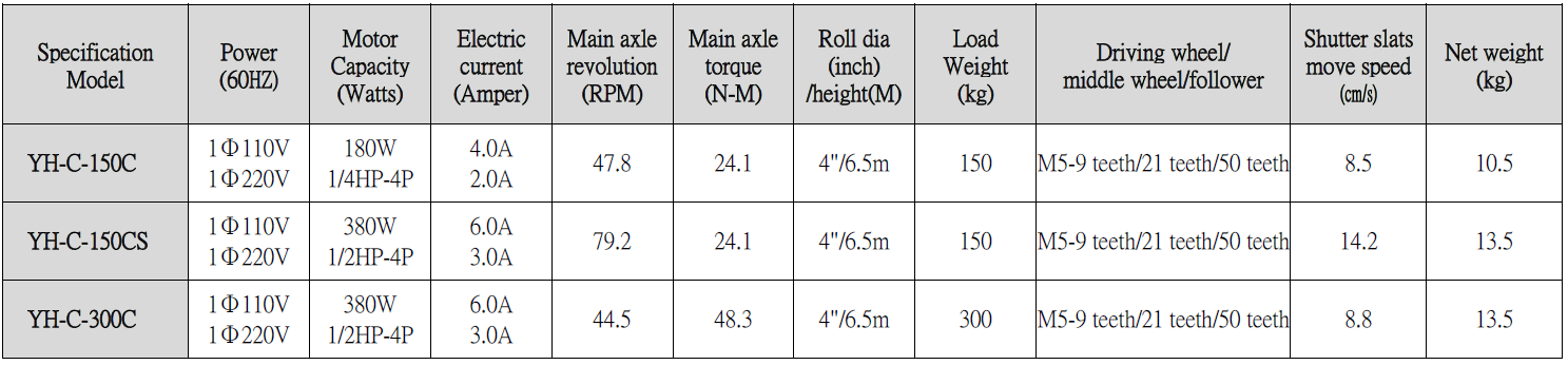 Specification of YH-C 150C~400C & 150CS~250CS