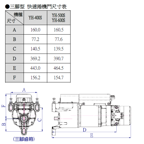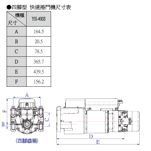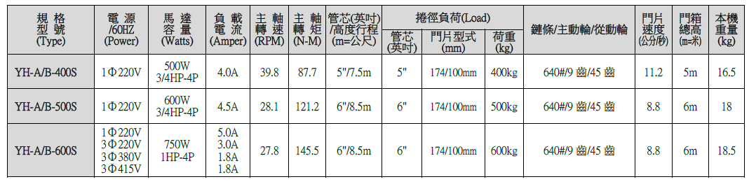 YH-A/B 400S~600S 快速捲門機生產規格一覽表