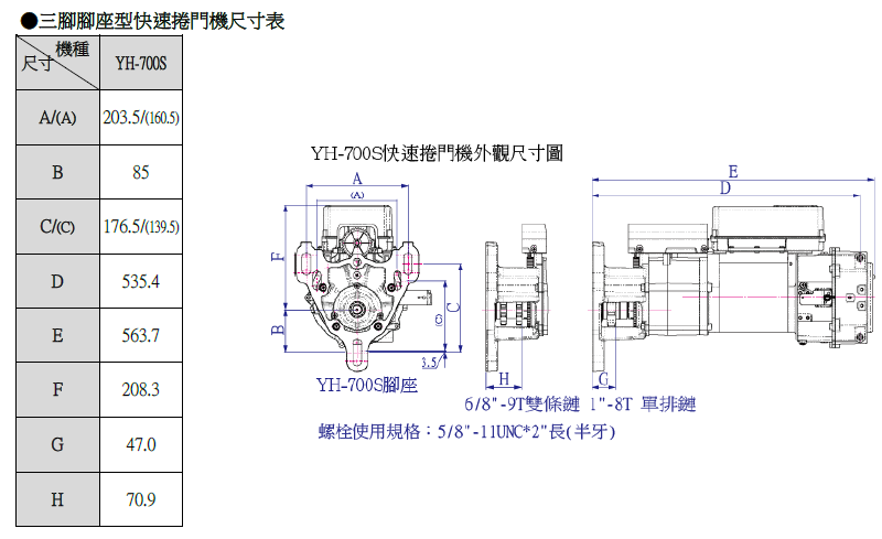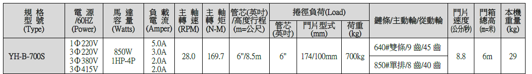 YH-B 700S 快速捲門機生產規格一覽表