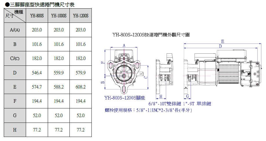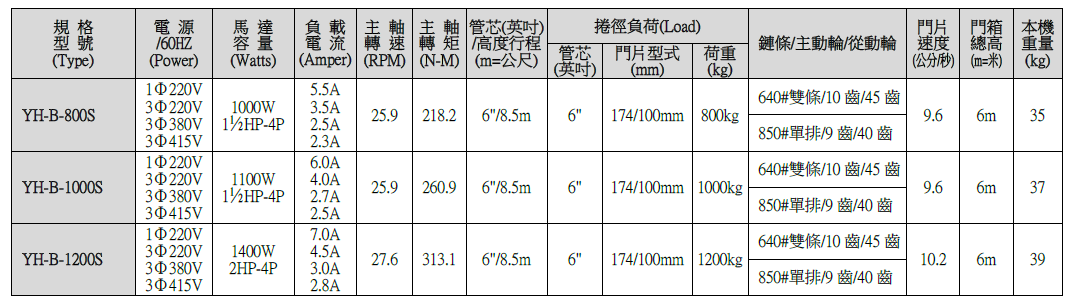 YH-B 800S~1200S 快速捲門機生產規格一覽表