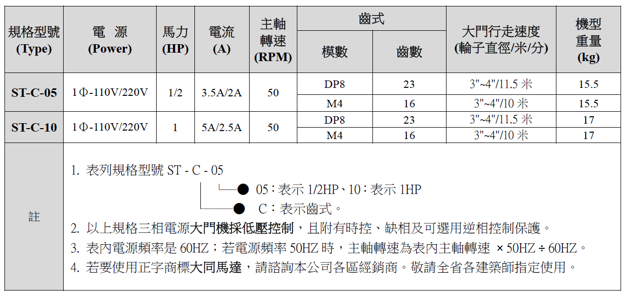 ST-C型大門機生產規格一覽表