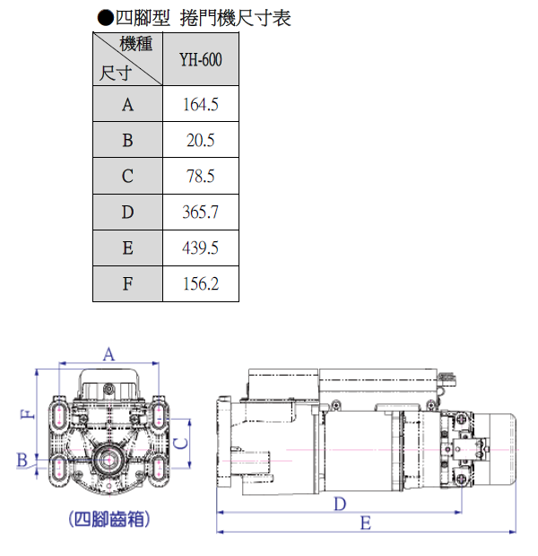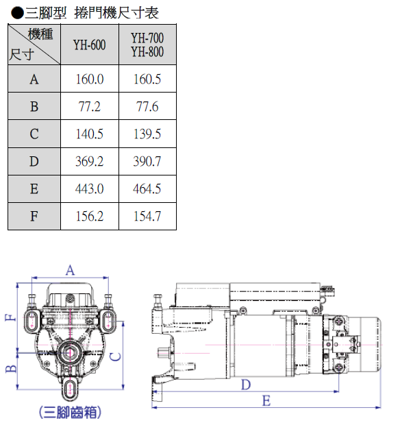 YH-A/B 600~800KG立式捲門機外觀尺寸圖 (單位:mm)