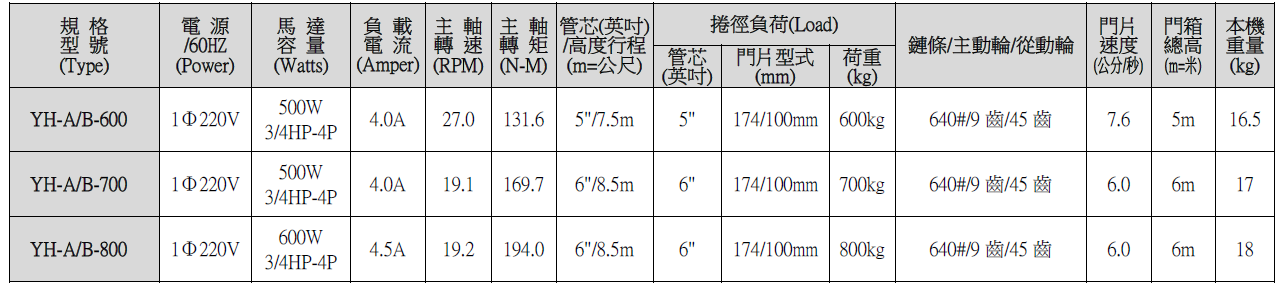 YH-A/B 600~800KG立式捲門機生產規格一覽表